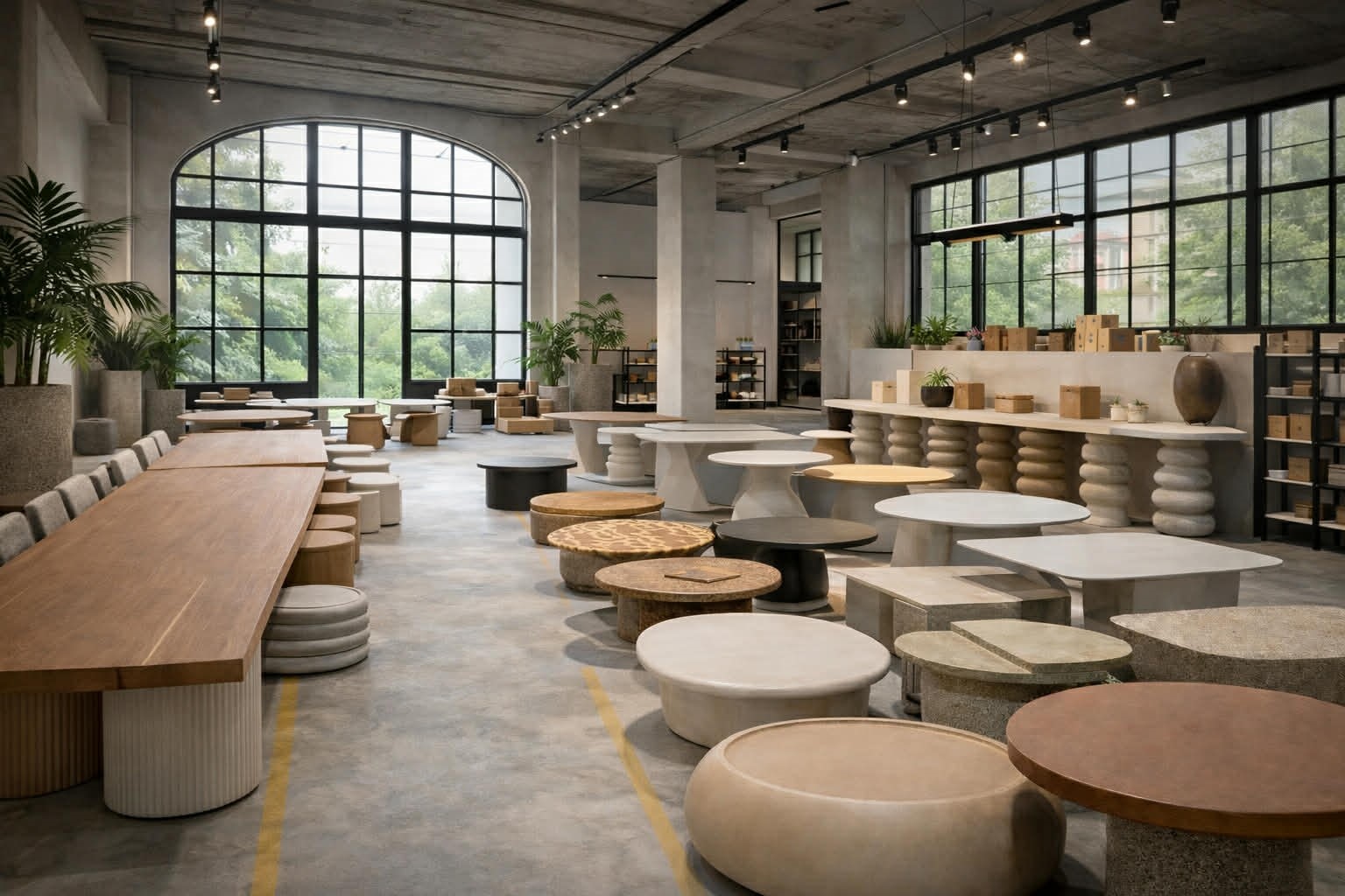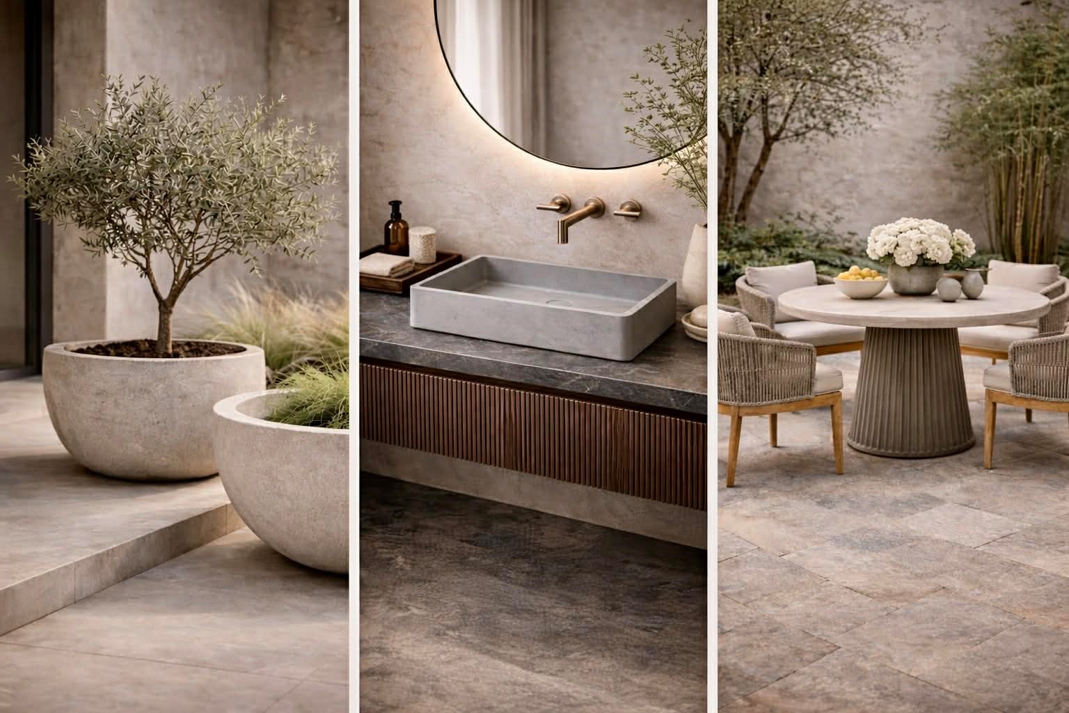 As the material reaches its final state, form and proportion come into focus. Sculptural planters, refined sinks, and concrete furnishings are defined by restraint and neutrality, designed to feel intentional rather than expressive. Each piece carries a quiet strength – crafted to integrate seamlessly across residential, commercial, and outdoor environments. The result is a collection unified by tone, texture, and architectural consistency.